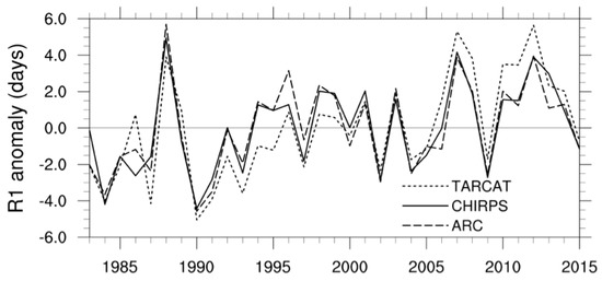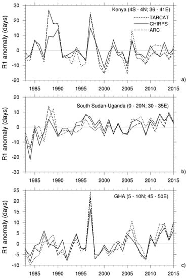 The largest differences are found in PRCPTOT, whereas R1 and CWD are the indices with the best agreement among the three products in terms of the sign of the trend (Figure 6d–f and Figure S7g–i) and trend significance. This is expected, due to the better agreement among the products in terms of R1 and CWD, than PRCPTOT and SDII. Comparisons among the average annual time series of the various indices for the three products over EA (not shown) show substantial agreement for CWD and R1, although with an overestimation of R1 by CHIRPS associated with the use of the TMPA 3B42 version 7 product for the CCD calibration [29]. All datasets show positive R1 trends over the Greater Horn of Africa (GHA, Somalia and eastern Ethiopia), South Sudan, and Uganda, while negative trends characterize eastern Kenya. The product with the widest high confidence areas is TARCAT (high confidence trends over Somalia, eastern Ethiopia, the Ethiopia–Eritrea border, South Sudan, and Uganda, but only a few cells with significant trends over Kenya), followed by CHIRPS and ARC2, both exhibiting significant trends over Kenya. In terms of the trend rates, the best agreement is between CHIRPS and TARCAT, with an R1 decrease over Kenya up to −0.6 precipitating days per year, although the magnitude of the changes is quite small. Similarly, R1 increases up to 1.2 days per year over South Sudan and Uganda. ARC2 is characterized by a more pronounced R1 decrease over Kenya up to −1.5 days per year, a generalized R1 increase over EA within 0.4 days per year, and limited areas with peak rates up to 0.8 days per year. The R1 anomaly time series (hereafter anomaly is the departure of an element from its long-period average value for the location concerned) of the three rainfall products, averaged over Kenya (4S–4N; 36–41E), South Sudan–Uganda (0–20N; 30–35E), and GHA (5–10N; 45–50E) (Figure 7), support the R1 trend analysis results: increasing positive anomalies characterize the South Sudan–Uganda region since 1994, while the increase of positive anomalies started only recently (since 2010) over GHA, usually dominated by R1 negative anomalies. Finally, a predominance of negative anomalies is detected over Kenya starting from 1991, which reach their lowest values around 2000 and 2005, with a slow recovery in recent years. The exceptions to this negative anomaly sequence are the years 1997–1998, 2002, and 2006.