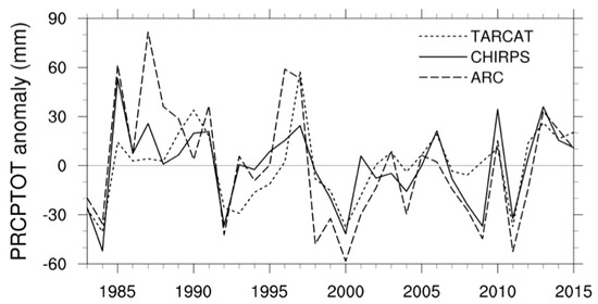 On the contrary, over the same zone, a decrease in JJAS PRCPTOT is observed from ARC2 data, with rate values up to more than 10 mm per season. A patchier situation characterizes eastern EA, with the simultaneous presence of negative and positive trend areas. The inspection of the PRCPTOT anomalies of the three products confirms the previous results for western EA and the limited agreement among the three products as for precipitation intensity (Figure 14): ARC2 is the rainfall product with the more pronounced sequence of negative anomalies starting from late 1990s (the linear trend rate for ARC2’s anomaly is −3.26 mm per season), whereas CHIRPS and TARCAT display similar anomaly variations with TARCAT, more oriented to an increase of positive anomalies since late 1990s. After all, western EA is a challenging area for the satellite precipitation estimation, due to the presence of a complex orography (Ethiopian Highlands) characterized by intense warm-type precipitation very often underestimated by IR-based algorithms [26,52]. Moreover, it is noteworthy that ARC2 pointed out a marked underestimation of precipitation over Ethiopia specifically during JJAS, motivated by the negative impact of the region’s higher elevations and the failure in capturing warm-type precipitation processes by a methodology based on a fixed brightness temperature (235 K) threshold in the GPI to identify precipitating clouds [25].
