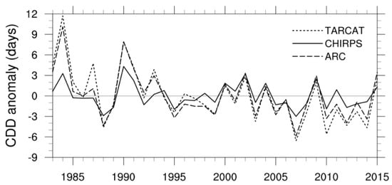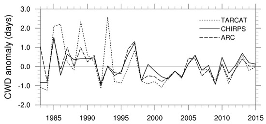 Scarce information can be extracted from the CWD trend analysis. Generalized weak positive trends come out of all datasets without significance (Figure 10d–f). Significant negative trends cover only limited areas over Ethiopia (central for TARCAT, and eastern for ARC2 and CHIRPS), central and coastal Kenya, DRC, Ruanda, and Burundi. Considering the average EA MAM CWD anomalies of each rainfall product, a behavior similar to that already observed for PRCPTOT stands out (Figure 12). The anomalies are characterized by a series of negative values interrupted only occasionally, which come after a period (1985–mid-1990s) of consecutive positive CWD anomalies. This change in sign is more evident for TARCAT, which is characterized by the highest values before 1995.