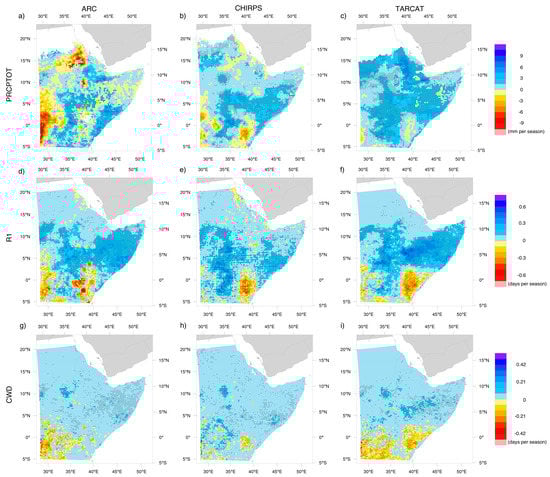 The spatial patterns of the R1 trends resemble those of PRCPTOT, in particular, for CHIRPS and TARCAT, with a correspondence between zones of negative (positive) PRCPTOT trends and R1 negative (positive) trends (Figure S11g–i), and very good agreement of the trend rate values between CHIRPS and TARCAT is found. Nevertheless, in this case, also, ARC2 provides R1 trend spatial patterns resembling those of the other two products, although with limited zones of significance, thus confirming the better agreement among the products with respect to R1, rather than the other indices already expressed in Section 4.1 for the annual trends. The agreement among the three products in terms of PRCPTOT over eastern EA (the area where MAM is the principal wet season) is highly variable from zone to zone (analysis not shown). Kenya, northern Tanzania, and the southern coastal Somalia are characterized by a better correspondence between ARC2 and TARCAT, whereas a wet bias seems to affect the CHIRPS total precipitation. It is very difficult to attribute this behavior to a specific characteristic of the three algorithms. The number of rain gauges steadily decreased in the area (http://chg.geog.ucsb.edu/data/chirps/stations/index.html#_africa, last accessed 11 June 2018); this affected CHIRPS and ARC2 datasets, which merge satellite estimates with simultaneous rain gauge measurements, but only marginally TARCAT, which uses an historical gauge archive for CCD calibration. However, probably this is not the right key to explain the CHIRPS wet bias with respect to ARC2 and TARCAT, which is stable over time without any apparent evolution. On the contrary, Somalia and eastern Ethiopia are characterized by a chronic rain gauge scarcity, and this could justify the better agreement between ARC2 and CHIRPS, similarly lacking of the rain gauge contribution, with respect to TARCAT, which underestimates PRCPTOT (the dry bias issue [26]).