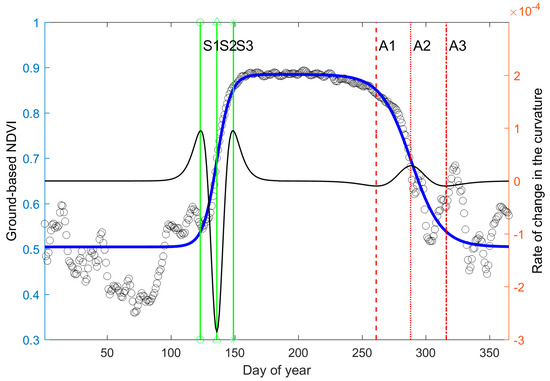 By tracking rate of local extrema in the rate of change of curvature [55,56], we can have 3 spring metrics (S1, S2 and S3) and 3 autumn metrics (A1, A2 and A3) from the fitted time series (Figure 1). S1, S2 and S3 represent the start of spring, middle of spring and end of spring, respectively; and A1, A2 and A3 stand for the start of autumn, middle of autumn and end of autumn, respectively. However, previous studies [57,58] showed that S2 and A2 derived from curvature change rates may be sensitive to dynamic of understory, canopy coverage and structure. According to the suggestion by Richardson et al. [6], we defined the middle of spring (S2) as the date when the fitted function reaches its half-maximum value in the ascendant part of the fitted curve; similarly, the middle of autumn (A2) is the date when the function reaches the counterpart in the ascendant part of the curve. Note that S2 and A2 are used as SOS and EOS in many studies [56,59,60] and we focused on these two metrics in this study.