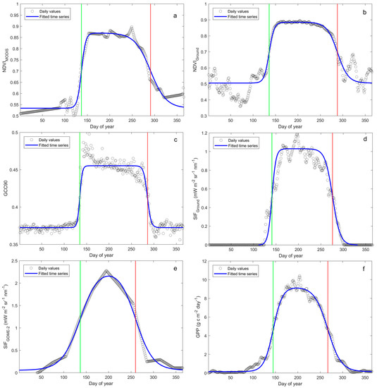 where represents the selected daily time series; is time (in days); and a–f are fit parameters: a and b decide the minimum and maximum limits of the function, respectively; c and d control the timing and slope of the increasing part of the time series which corresponds to the leaf development phase, respectively; and e and f control the timing and slope of the decreasing part of the time series that corresponds to the leaf senescence phase, respectively.