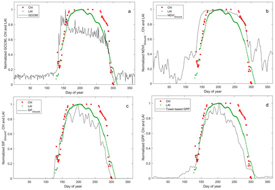 Comparison of physiological properties including leaf area index (LAI) and leaf chlorophyll content (Chl) versus the 90th percentile of the green chromatic coordinates (GCC90) (a), ground-based NDVI (NDVIGround) (b), ground-based SIF (SIFGround) (c) and tower-based GPP (d) at Harvard Forest in 2014. All the time series are normalized and have a daily time step.