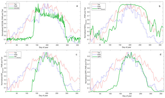 Comparison of surface air temperature (Tair) and Photosynthetically Active Radiation (PAR) versus: 90th percentile of the green chromatic coordinates (GCC90) (a); ground-based NDVI (NDVIGround) (b); ground-based SIF (SIFGround) (c); and tower-based GPP (d). All the time series are normalized and have a daily time step. PAR time series is the 5-day average.