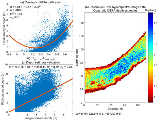 One consequence of sampling, particularly for OBRA relations that include an term such that d is not monotonically related to X, is that a lack of shallow field observations can lead to minimum predicted depths greater than the smallest actual depths; the resulting bathymetric maps are too deep along the edges of the channel. This scenario is illustrated in Figure 1, an example from the Deschutes River in Oregon, USA. The quadratic X vs. d relation shown in Figure 1a reaches a minimum at a depth of 0.73 m, with lesser values of X resulting in deeper rather than shallower depth estimates. Applying this OBRA equation to the hyperspectral image thus leads to a bathymetric map with unrealistically deep water near the banks (Figure 1b). The observed vs. predicted regression used for validation highlights the absence of image-derived depth estimates shallower than 0.73 m despite numerous field observations in this range (Figure 1c).