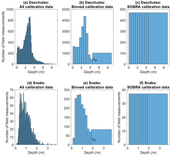 SOBRA involves binning the depth measurements and then retaining the same number of samples from each bin. Input parameters for SOBRA include the number of depth bins and the lower limit of the deepest bin, specified as a percentile of the distribution of depths in the original field data set. Histograms for the original, binned, and final SOBRA calibration data sets for the Deschutes and Snake rivers are illustrated in Figure 3. We used 10 bins, with the lower bin limits equally spaced between the minimum depth in the field data set and the 95th percentile, denoted by ; all depths greater than are assigned to the last (deepest) bin (Figure 3b,e). The bin containing the smallest number of measurements is used to establish the sample size and the same number of observations are randomly selected from each of the other bins (Figure 3c,f). Once established, the stratified calibration data set is used as input to OBRA. OBRA and OP regression values were used to quantify the effects of stratification on depth retrieval accuracy.