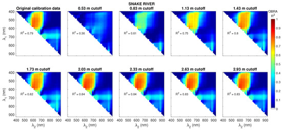 Figure 5 depicts a similar pattern for shallow cutoff depths on the Snake River, with OBRA increasing and the range of useful wavelength combinations expanding as cutoff depth increased up to about 2 m. OBRA then stayed relatively constant for cutoff depths approaching 3 m, rather than decreasing for larger cutoff depths as occurred on the Deschutes. Even when all of the field data were included (i.e., the original data set), the first panel in Figure 5 indicates that the relationship between X and d remained strong () across a broad range of visible band ratios. OBRA matrices for all 51 cutoff depths used on the Snake River are combined in Video S2, which shows the strength of the X vs. d initially increasing rapidly with cutoff depth, stabilizing around 2 m, and then remaining steady as the cutoff depth approached the largest observed depth.