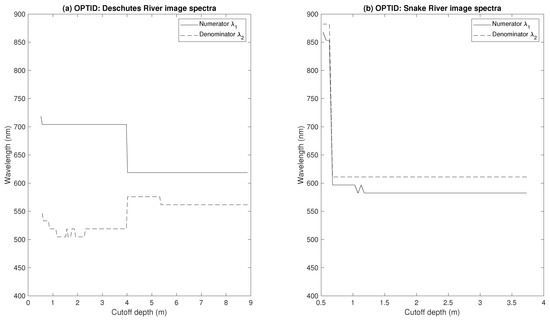 Summary of Optimal Band Ratio Analysis (OBRA) of Progressively Truncated Input Depths (OPTID) results for image spectra from the (a) Deschutes and (b) Snake Rivers. The numerator and denominator wavelengths identified by OBRA are plotted for each cutoff depth.