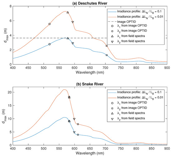 Maximum detectable depths calculated from measured irradiance profiles for two different values of for the (a) Deschutes and (b) Snake Rivers. Also plotted for each site are values based on the irradiance profiles for the numerator () and denominator () wavelengths identified via OPTID of hyperspectral images and field spectra. For comparison, the inferred from OPTID of the Deschutes River image is represented by the dashed line in (a).