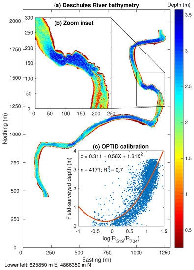 The OPTID procedure provides a robust means of identifying the limitations associated with spectrally based bathymetric mapping and can thus help to promote more informed use of remotely sensed data. For example, an image-derived depth map based on OPTID output is presented in Figure 9a. The OBRA relation for the 3.57 m cutoff depth inferred to represent the sensor’s was used to produce both the depth map and the calibration scatter plot shown in Figure 9c. This plot compares favorably with Figure 1a, which included all of the field data available for calibration. Truncating the data set increased the OBRA value and yielded a shallower minimum predicted depth of 0.25 m, as opposed to 0.73 m when all of the field data were used. The color scale for the depth map in Figure 9a extends from this minimum to the inferred of 3.57 m and thus provides a more detailed, realistic visualization of the plausible range of depth estimates than the bathymetric map in Figure 1b, which was produced without any kind of truncation or sampling. We also rearranged the X vs. d relation in Figure 9c to determine the X value corresponding to and then used this X value as an image threshold to mask out pixels likely to have depths in excess of . This threshold was exceeded for a very small proportion of the channel, less than 0.1%; the masked pixels are barely noticeable even in the zoom inset shown in Figure 9b. This representation indicates that the sensor’s dynamic range for depth retrieval encompasses the majority of the channel. Moreover, truncating the range of input depths used for calibration improved depth retrieval within the shallow portions of the channel that are of primary interest for many practical, habitat-oriented applications. These results imply that even if spectrally based bathymetric maps are constrained by a maximum detectable depth, valuable information can still be derived from passive optical image data for those portions of the channel shallower than , which could be extensive in many cases. OPTID provides a rigorous approach to distinguishing—empirically, for a given image—between areas where depth estimates might be considered reliable and areas where depth estimates should be disregarded.