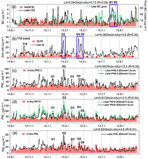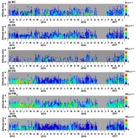 - The time variation of lidar-derived mass concentration of SS was generally consistent with in-situ aerosol measurements. However, we found some overestimation of SS mass concentration. In-situ and MMRL measurements suggested internal mixing between DS and nitrate during all dust events in 2015; this internal mixing may cause misclassification of DS as SS, and thus lead to overestimation of SS. The internal mixture of DS and water-soluble substances (e.g., nitrate and sulfate), as well as the mixture of BC and water-soluble substances will lead to better estimation of aerosol components.