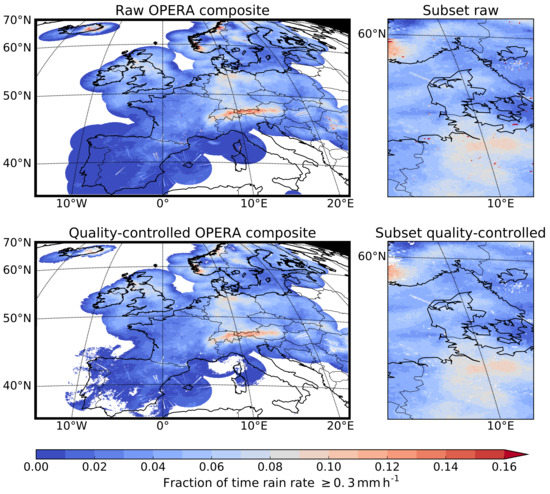 Maps depicting the fraction of time in summer 2017 during which the radar product is available and the rain rate is ≥0.3 mm h for the raw OPERA composite (top) and the quality-controlled OPERA composite with unreliable regions masked out and thus shown in white (bottom). A zoomed-in version of the composite is provided on the right.