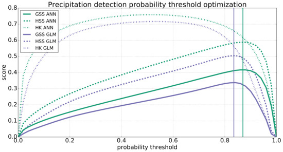 In order to be able to carry out predictions for the actually observed unbalanced problem, the decision boundary, i.e., the probability threshold that is used to categorize model output into precipitating and non-precipitating pixels, needs to be adjusted with the help of the unbalanced validation set for the GLM and the ANN. We chose to optimize the GSS which automatically implies maximizing the HSS too (see Appendix A.1). This can be nicely observed in Figure 2. For the LOGREG model, the optimal threshold probability amounted to 0.835, and, for the MLP classifier, it was 0.870. It is furthermore evident that HK would be maximized at 0.500, since it considers both classes separately irrespective of their climatological frequency, which would lead to many false alarms in the unbalanced classification problem.