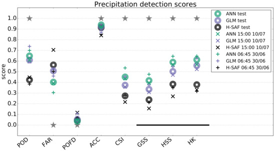 Precipitation detection verification scores for the test set (circles) and for the two case studies (15:00 UTC 10 July: convective, crosses; 06:45 UTC 30 June: stratiform, pluses) in summer 2017. The ANN is given in green, the GLM in purple, and H-SAF in black. The grey stars denote the perfect scores and the black horizontal line, the zero skill line.