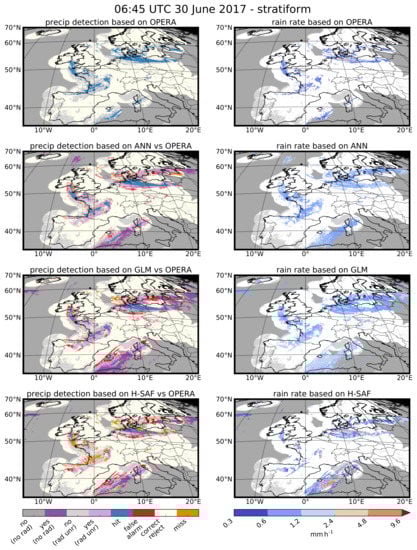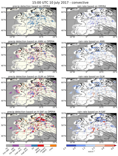 In terms of precipitation detection, the skill in the convective case is slightly below average for the GLM and the ANN while it is very low for H-SAF (Figure 3 crosses). This is almost exclusively attributable to the H-SAF’s large amount of false alarms, which is reflected in its large FAR. This strong H-SAF outlier in terms of false alarm performance highlights the big case-to-case variability of the scores and underlines that the average performance derived from the test set is not representative for every single scene. However, it should also be noted that we specifically chose to show an extreme case of a false alarm outlier performance here.