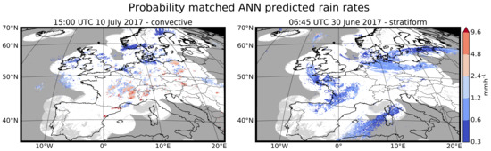 The LINREG minimizes the residual sum of squares between the OPERA measurements and the predicted rain rate. Similarly, the MLP regression minimizes the squared error loss function between them. Thus, strong deviations from the OPERA reference are heavily penalized and smooth predictions around the mean are favored. This leads to the best possible scores but not realistically looking precipitation fields. If visual consistency with radar fields and the ability to represent a more realistic rain rate distribution are valued higher than quantitative prediction skill, probability matching is a helpful tool. Probability matching carries out a nonlinear transformation to recover higher order statistics (such as variance and skewness) by means of empirical quantile matching of predicted rain rates with observed rain rates. In this study, the transformation from predicted rain rates into OPERA rain rates was derived on the validation set and then applied to the predictions resulting from the test set and the case studies.