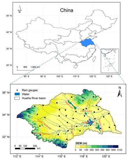 Geographical location, DEM and the distribution of rain gauges in the Huaihe River basin.