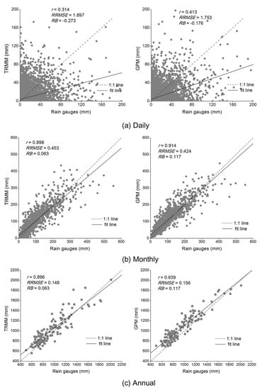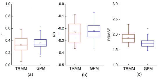 The GPM IMERG v5 and TRMM 3B42 v7 precipitation products overestimated precipitation at monthly and annual scales (Figure 2b,c), which was mainly because the satellite precipitation estimates were usually greater than zero when the gauges showed no rainfall. When the time scale increased, the r values were significantly improved, and the RRMSE values were significantly reduced. Similar findings have been reported in previous evaluation results [15,22]. A reason for the higher accuracy of satellite precipitation products at monthly and annual scales was that the GPCC monthly product was used for bias-correction of the 3B42 v7 and IMERG v5 products [11,40].