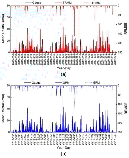 Time series of RRMSE (dash line) and mean daily precipitation (solid line) from 2015 to 2017 over the Huaihe River basin: (a) TRMM 3B42 v7, (b) GPM IMERG v5.