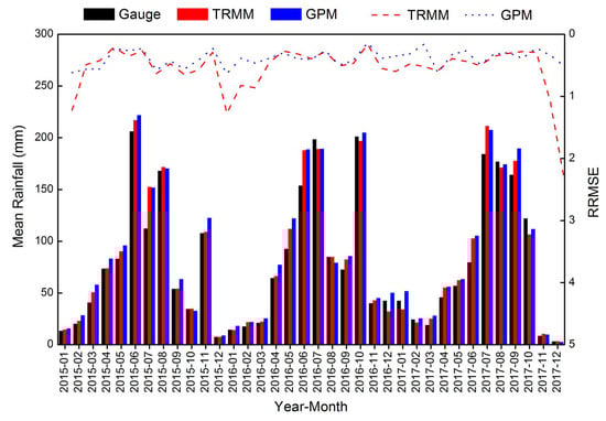 Time series of RRMSE (dot/dash line) and mean monthly precipitation (bar graph) from 2015 to 2017 over the Huaihe River basin.