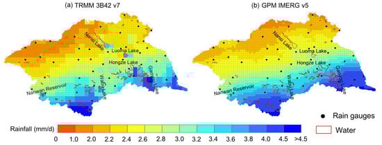Figure 5 shows the spatial distribution of mean daily precipitation from 2015 to 2017 retrieved from TRMM 3B42 v7 and GPM IMERG v5 in the Huaihe River basin. The spatial patterns of two satellite precipitation products were similar, with precipitation decreasing from the southeast to the northwest. It was found that rainfall greater than 4.0 mm/day mainly occurred in the south and southeast of the Huaihe River basin, while the relatively small rainfall occurred in the west and north. A distinct dividing line appears with the mean daily precipitation value of about 2.2 mm/day (approximately 800 mm/year), which could be explained as the geographical boundary between China’s southern and northern regions. Additionally, the abnormal blue pixels in Nansi lake, Luoma lake, Hongze lake, and Nanwan reservoir in Figure 5 show that the TRMM 3B42 v7 precipitation exhibited significant overestimation over water bodies, while the GPM IMERG v5 precipitation provided more consistent precipitation estimates with much lower systematic overestimation in these areas due to the employment of a unified and updated PMW retrieval algorithm (GPROF V05).