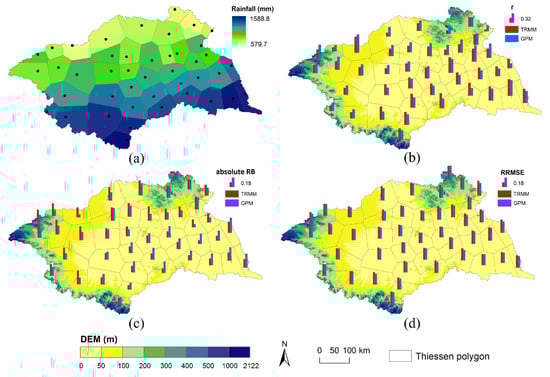 Evaluation results at each individual gauge station in the Huaihe River basin from 2015 to 2017. (a) Annual rainfall of rain gauge; (b–d) r, absolute RB, and RRMSE of 3B42 v7 and IMERG v5 precipitation products.