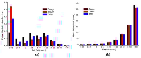 Figure 8a,b presents the probability distribution function (PDF) and the mean daily precipitation estimated by gauge data and satellite products at different rainfall thresholds. The PDF and mean daily precipitation are of great importance for hydrological applications. The PDF of the two satellite precipitation products in Figure 8a were mainly concentrated at the rainfall rate of 0–0.5 mm/day (above 35%). The 3B42 v7 and IMERG v5 precipitation estimates had an obvious overestimation of PDF at small rainfall from 0–0.5 mm/day, while there was a tendency to underestimate the gauge precipitation when the rainfall rate was greater than 0.5 mm/day. The satellite precipitation estimates show similar mean daily precipitation to gauge observations in Figure 8b. The satellite estimates overestimated the mean daily precipitation at the rainfall rates from 0.5 to 25 mm/day, but tended to underestimate light (0–0.5 mm/day) and heavy (>25 mm/day) precipitation. Specifically, there was an obvious underestimation when the rainfall rates were greater than 100 mm/day.
