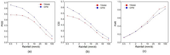 The daily results of three metrics (POD, CSI, and FAR) for different rainfall thresholds are shown in Figure 9. High values of POD and CSI at rainfall rates from 0.5–2.0 mm/day indicated that satellite precipitation estimates had better performance. The POD and CSI were reduced, and the FAR was increased with increasing rainfall rate, which indicated the limited capability of satellite sensors for detecting heavy rainfall events. The relatively high POD and CSI also showed that IMERG v5 was better than 3B42 v7 for detecting precipitation in the study area, especially for rainfall rates of 0–2.0 mm/day.