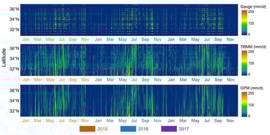 Figure 10 shows the continuous rainfall events of the rain gauge, 3B42 v7 and IMERG v5 precipitation data over the Huaihe River basin from 2015 to 2017. The daily rainfall rate was plotted according to its occurrence time and latitude. Both satellite products could better characterize the gauge precipitation distribution, while the relatively sparse gauge sites led to the loss of some important rainfall events, such as the rainfall events from 31°–34° N in late January and the strong precipitation in November. Satellite precipitation estimates can effectively detect spatial precipitation patterns and might be an alternative in the areas where the rain gauge stations are sparse.