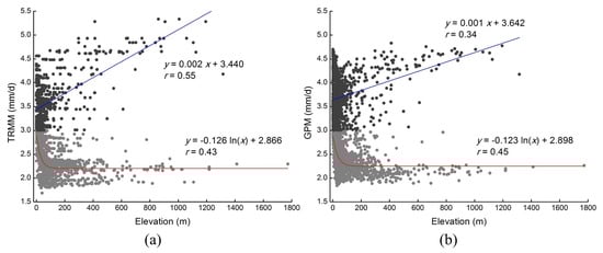 Scatterplots of mean daily precipitation of TRMM 3B42 v7 (a) and GPM IMERG v5 (b) precipitation products against the elevation over the Huaihe River basin.