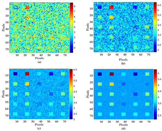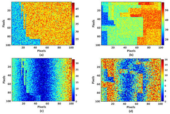 Figure 1. Band 100 at (2200 nm) of the pixelwise reflectance estimate adding random sensor noise to the at-sensor radiance with SNR (a) 30 dB; (b) 40 dB; (c) 50 dB and (d) 60 dB.