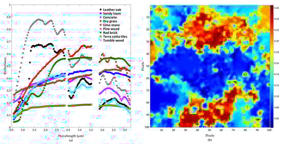 The objective of using the vegetation surface comprising commonly available materials is to experiment with common airborne imaging conditions. Usual scattering condition refers to moderate scattering conditions with visibility between 23 km to 40 km, approximately equivalent to the AOD range 0.33–0.20. We use spectra of nine materials to generate the image, namely: leather oak, sandy loam, concrete, dry grass, lime stone, pine wood, red brick, terracotta tiles, and tumble weeds. The spectra of the materials and the synthetic vegetation surface are shown in Figure 2 and their fractions in Figure 3.