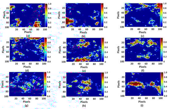 True fractional abundances of the endmembers in the synthetic vegetation image: (a) leather oak; (b) sandy loam; (c) concrete; (d) dry grass; (e) lime stone; (f) pine wood; (g) red brick; (h) terracotta tiles; and (i) tumble weeds.