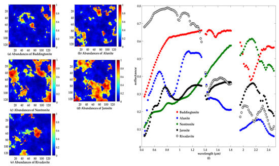 blueTrue fractional abundances of the materials used to generate a geological dataset with spectrally distinct materials: (a) Buddingtonite; (b) Alunite; (c) Montmorillonite; (d) Jarosite; and (e) Rivadavite; and their spectral profiles (f).