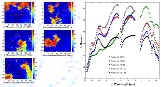 True fractional abundances of the materials used to generate a geological dataset with spectrally similar materials: (a) Nontronite GDS41; (b) Nontronite NG 1.a; (c) Nontronite NG 1.b; (d) Nontronite SWa 1.a; and (e) Nontronite SWa 1.b; and their spectral profiles (f).