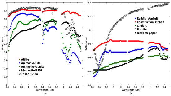 - Kokaly, R.F.; Clark, R.N.; Swayze, G.A.; Livo, K.E.; Hoefen, T.M.; Pearson, N.C.; Wise, R.A.; Benzel, W.M.; Lowers, H.A.; et al. USGS Spectral Library Version 7; Technical Report; U.S. Geological Survey Data Series 1035: Reston, VA, USA, 2017. [Google Scholar]
