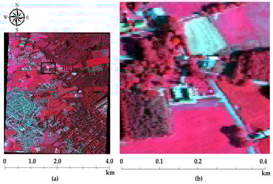 False color representation of the real APEX image (a) and the experimental sub-scene (b) for the Liereman area (within 51.30653 N, 5.013669 E and 51.33816 N, 4.984975 E) in Belgium.