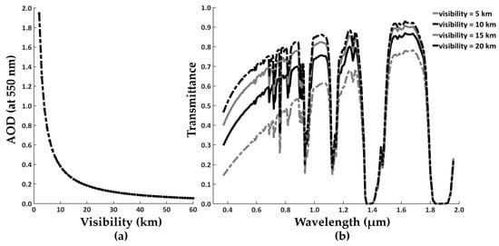 Relation between visibility and AOD (a) and the effect of visibility on atmospheric transmittance (b). The standard MODTRAN 4 Mid-Latitude Summer model with correlated k-option is used with column water vapor = 2.0 g cm and the other atmospheric parameters are at their default values.
