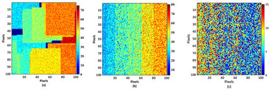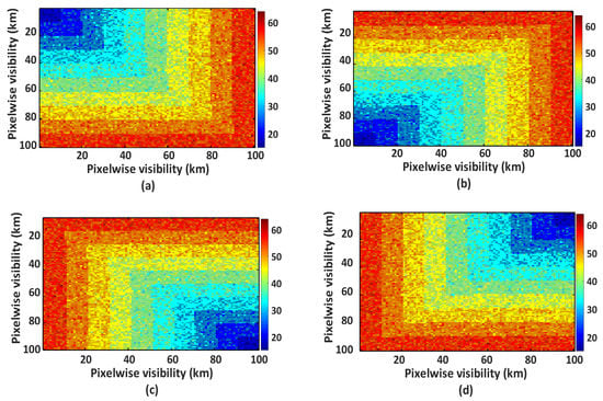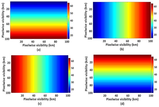 From the ranges of visibility and , we derive their spatial pattern or variability over each pixel, as we may find in real scenes, for the forward modeling. For the simulated datasets, a gradual increase in visibility which varies between 15 km and 65 km corresponding to an AOD range 0.47–0.13 was realized. The direction of variation is taken from the left of the simulated images to the right, i.e., column wise, with a step size of 2 km. To each pixel in a column, randomly sampled values from the log–normal (, 0.02) with 15 km for the first column are assigned. A log-normal distribution is used to approximate the actual distribution of visibility, being a skewed normal distribution (Figure 9). The resultant spatial variability of visibility is shown in Figure 10a.