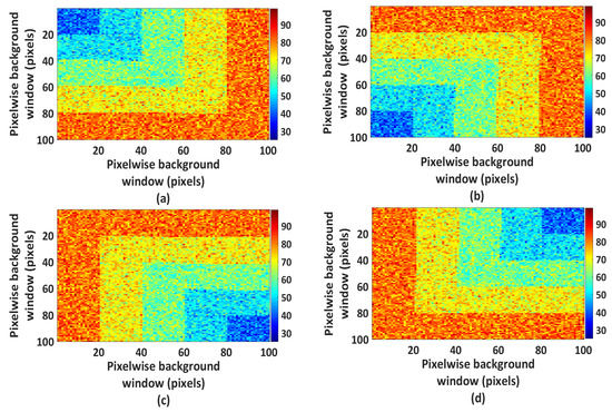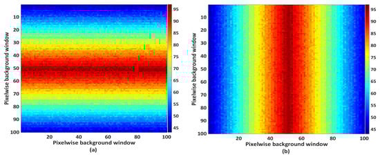 The interpolation method used in this study is weighted average inverse distance to power method. This choice is based on the assumption that for a small scene pixels that are close to the target pixel are contributing more to the background radiation than those that are farther apart. Moreover, for small area the choice of the interpolation method is not critical. Further, any uncertainty arising from the interpolation method is tractable. It is because the spatial extent of neighboring pixels is based on an adjacency range, which is calculated using the three step process defined in Section 5.4. While performing experiments for different spatial variations of the two parameters, low performance was expected when visibility was diagonally varying, especially to solve Case 3. We hypothesized that the nearest neighbor method could affect the performance of the method for various diagonal variations (as shown in Figure 13, Figure 14, Figure 15 and Figure 16). However, no notable variation in the performance was observed. This is attributed to the small area where choice of the interpolation method was not critical. More experiments can be performed to test the effect of spatial variation on the performance for larger scenes. As for the small area the choice of interpolation method is not critical, the choice of the interpolation method made in this article is based on the computation speed. For instance, the nearest neighbor interpolation method is faster than the cubic or spline-based interpolation methods.