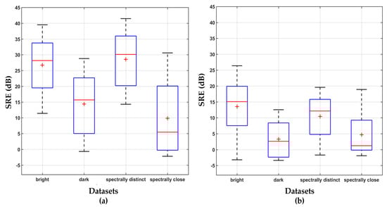From the performance of reflectance and abundance estimates under high scattering conditions with the albedo effects, as sown in Figure 17, we observe that the overall performance of abundance estimates are lesser than the performance of reflectance estimates. This might be due to the inherent limitations of the unmixing method, their numerical approximations, and the non-linear propagation of uncertainty from visibility to abundance estimates via AC. Further, the performances of reflectance and abundance estimates for bright surface and for dataset with spectrally distinct materials are higher than the performances for dark surface and for dataset with spectrally similar materials. Bright targets reflect more radiation energy than dark targets. Thus, for the bright targets the majority of the at-sensor radiance consists of photons that are not scattered. In contrast, most of the photons for the dark targets are scattered [27,66]. This contribution amplifies under high scattering conditions resulting in performance degradation.