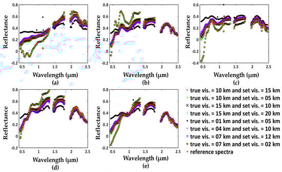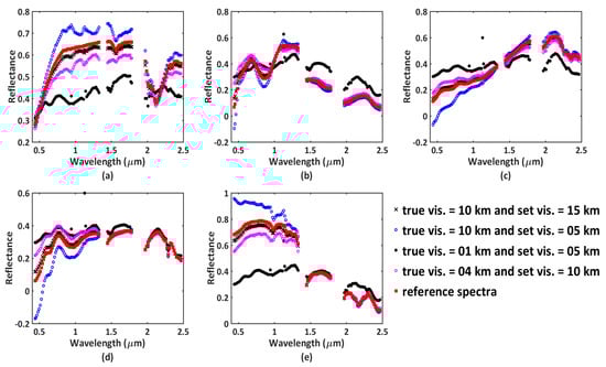 As established in the literature, a variability in aerosol optical depth affects the amplitude of the retrieved spectra. This influence was not linear, in the sense that deviations from the reference spectra depend on the surface reflectance of the target, the wavelength, and the scattering conditions [6]. This observation is consistent with our previous work [26,27]. For high aerosol optical depth values and high surface reflectance (>), the estimated reflectance was higher than the reference reflectance, whereas for low surface reflectance (<) estimated spectra were lower than reference spectra. This consistently happened for spectra of all considered endmembers. An opposite pattern was observed for low scattering conditions. In [67], a threshold was introduced as a critical parameter to determine how the estimated reflectance changes due to aerosol scattering. Applying this threshold we found that if > 1, then the estimated surface reflectance was underestimated, otherwise it was overestimated. The changes in the estimated reflectance were negligible when aerosol optical depth approaches the reflectance value. Considering these effects, the results of all nine visibility combinations (Table 2) are not shown in Figure 18, Figure 19 and Figure 20. It is because for extremely high scattering conditions reflectance estimates are either significantly overestimated or underestimated, (especially in the blue wavelength region) which may bias the analyses. As discussed earlier, the airborne remote sensing is not performed under such high scattering conditions. However, the analyses give a useful insight into the effect of those conditions on the spectral quality of the data and ultimately to the performance of the proposed method. These results might be useful to spaceborne data.