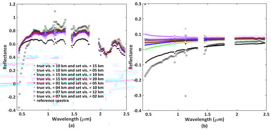 Effects of scattering, variation in visibility, and surface albedo on spectral qualities (of a randomly selected pixel) used to generate the bright (a) and dark (b) surfaces.