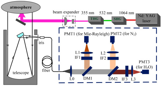 Lidar is a powerful tool used in remote sensing for characterizing atmospheric components and atmospheric properties [8,9,10,11]. With the development of laser technology and Raman spectroscopy, Raman lidar has succeeded in measuring atmospheric temperature, water vapor, and aerosols [12,13,14]. Vibrational Raman scattering signals from water vapor molecules (H2O) and nitrogen molecules (N2) have been widely used in the detection of water vapor profiles [15,16]. The potential of Raman lidars is not only to investigate synchronous multi-parameters profiles and the correlations among them, but also to study aerosol hygroscopic growth by combining water vapor and aerosols [17,18,19,20]. Many ground-based Raman lidar systems currently exist around the world, and significant achievements have been made in the measurement of water vapor and aerosol profiles [21,22,23,24]. At present, atmospheric water vapor mixing ratio profiles can be achieved up to the entire troposphere by Raman lidars. However, methods for all-day water vapor measurements with high precision must still be developed because of the strong solar background light in the daytime.