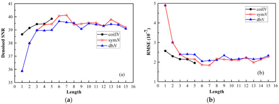 The influence of the wavelet base function on the denoised results is first discussed. Because of the discrete signals, we focused on three common discrete wavelet families: Daubechies (dbs) wavelet base, Symlets (syms) wavelet base, and Coiflet (coifs) wavelet base. Figure 2a shows the denoised SNR and RMSE results by using three wavelet bases with different filter lengths. It can be clearly seen that the denoised SNRs differ greatly under different wavelet bases with filter length. Taking the coifN wavelet base as an example, we can find that the denoised SNR gradually increases from 38.5 to 40 with the filter length increasing from 1 to 5, and the denoised RMSE decreases gradually. Taking symN and dbN as the wavelet base, the filter length exerts great influence on the denoised results, and the denoised SNR is increased under a shorter filter length, followed by a decline and leveling off under a longer filter length. Overall, the denoised results by symN are better than those by dbN; in particular, the maximum denoised SNR and the minimum RMSE can be achieved with the wavelet bases of sym6 and sym7.