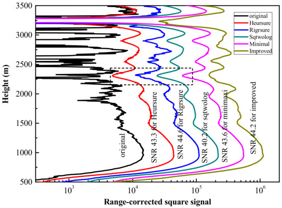 Common threshold selection methods include Heursure, Rigrsure, Sqtwolog, Minimaxi, and improved threshold selection. Here, we discuss the effect of threshold selection methods on the denoised results. As shown in Figure 4, the obtained RSCS and the denoised SNR by using different threshold selection methods are compared with those of the original signals. Regarding the overall shape, it can be seen that a certain denoised effect has been achieved; however, different details exist at certain heights. The denoised RSCS presented obvious oscillation with the Rigrsure threshold method, and a large distortion can be observed at ~2250 m. The distortion phenomenon also exists for other threshold methods except the improved threshold method. A smooth shape and no large distortion were observed in the denoised RSCS using the improved threshold method. The denoised SNRs are also given in the figure, revealing that a denoised SNR of 44.2 can be achieved using the improved threshold method. We further discuss the denoised results using different threshold functions, including the soft threshold function, hard threshold function, and improved threshold function. When using the wavelet base of sym6 and the improved threshold selection method, weak oscillations exist for the hard threshold function, and a similar but smoother RSCS shape can be obtained using the soft threshold and the improved threshold function. Moreover, the denoised SNR with the improved threshold function can reach 49.66, which is much higher than that for the soft and hard threshold of 46.22 and 44.15, respectively.
