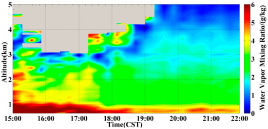 THI plot of water vapor mixing ratio during 15:00–22:00 CST on 15 September 2016, by Raman lidar.