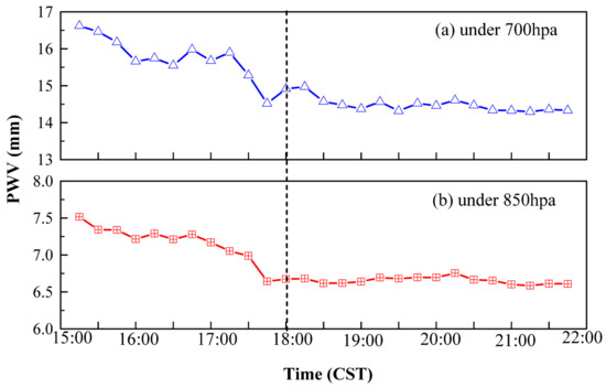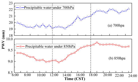 To clearly explain variations, the time series is divided into two periods: 15:00–18:00 and 18:00–22:00. The PWV below 700 hPa declined slowly from 16.5 mm to 15.5 mm during 15:00–17:00 and decreased rapidly to 14.5 mm in the next hour; a slight increase appeared after 18:00 and then leveled off with a value of 14 mm until 22:00 CST. The temporal change in PWV below 850 hPa is also shown in Figure 7. There was a modest PWV decrease before 17:00, with a sharp decline occurring at 17:00–18:00, and then, the trend was observed to be stable until 22:00 CST. Obviously, the variation trend in PWV below 700 hPa agrees well with that below 850 hPa. The PWV in both layers by lidar presented a downward trend from the afternoon to the night, with a larger PWV in the afternoon and a lower value in the evening.