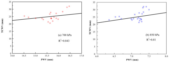 The correlation analysis between TCWV and PWV at the two layers was also discussed, and the results are shown in Figure 9. We can see that TCWV and PWV at the layer below 700 hPa yield a good positive correlation with a correlation coefficient of 0.843, and a correlation coefficient of 0.81 was also obtained between TCWV and lidar PWV at the layer below 850 hPa. Therefore, it is indicated from this case study that the diurnal variation in atmospheric water vapor presents a downward trend across the entire afternoon, and also that the lidar PWV in the bottom layer has a good relationship with the total water vapor content.