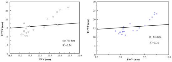 Correlation analysis of the total water vapor amount with PWV below 700 hPa and below 850 hPa.